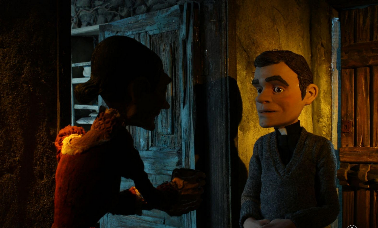 If The Apostle had been live action, it would’ve still been bleak. But the stop-motion animation creates a creepier feel, and it’s not just about aesthetics. Stop motion is inherently unnatural. Movements are jerky. Faces are stiff. There’s always something subtly “off,” even when it’s done perfectly. And here, Cortizo leans into that offness. The characters’ stiff smiles, their heavy lidded eyes, they don’t look alive. They look like people who forgot how to be people. Psychologically, this taps into what’s called the “uncanny valley” effect, when something looks almost human but not quite, it triggers a primal discomfort. It’s our brains’ way of screaming something is wrong here. In The Apostle, every frame pushes you deeper into that uncanny valley. It’s like watching a dream where the people you love have been replaced with hollow puppets that just pretend to know you.